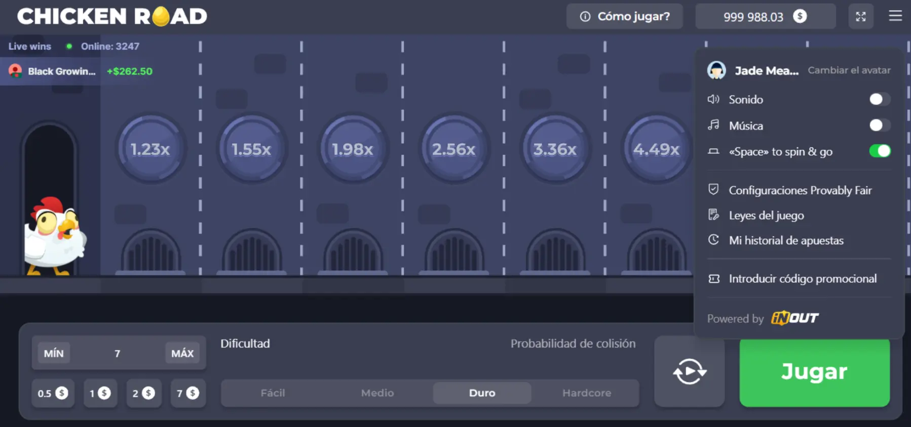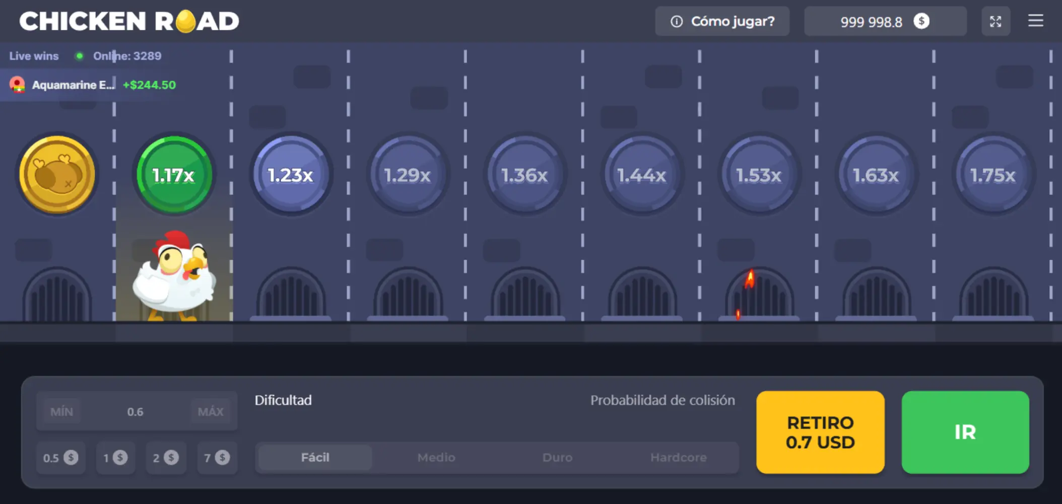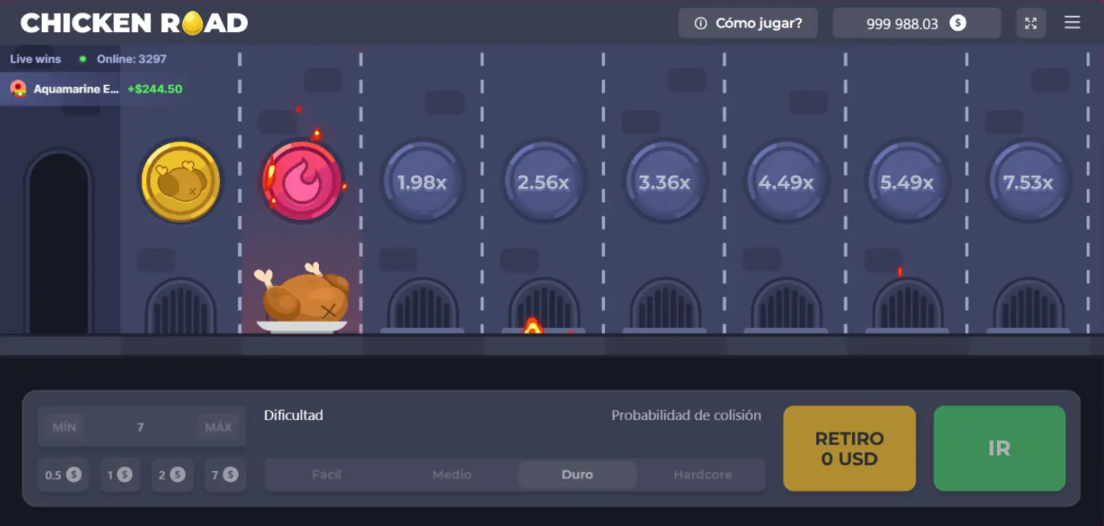 Ahora, ¿qué pasa con el multiplicador creciente en hardcore? Pues bien, nuestro juego inicia en 1.63x y en tan sólo 4 casillas, el multiplicador aumenta a 9.08x lo apostado, lo que hace de esta dificultad algo atractivo.En cuanto a las dificultades medio y duro, funcionan de la misma forma, con multiplicadores más bajos, pero que de igual forma dejan ganar dinero en Chicken Road.